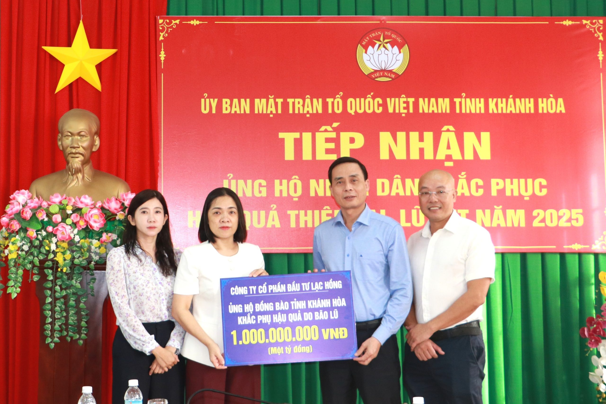 Sáng 03/12, tại trụ sở MTTQ tỉnh Khánh Hòa, Công ty CP Đầu tư Lạc Hồng đã trao 1.000.000.000 vnđ (Một tỷ đồng) hỗ trợ người dân khắc phục hậu quả thiên tai. Đây là hoạt động hưởng ứng lời kêu gọi của Ủy ban Trung ương MTTQ Việt Nam, thể hiện tinh thần nghĩa đồng bào hướng về miền Trung sau đợt mưa lũ nặng nề.